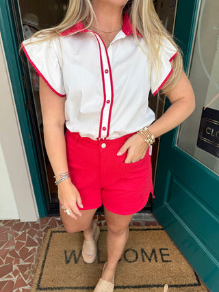 Red Patch Pocket High Waist Cotton Shorts