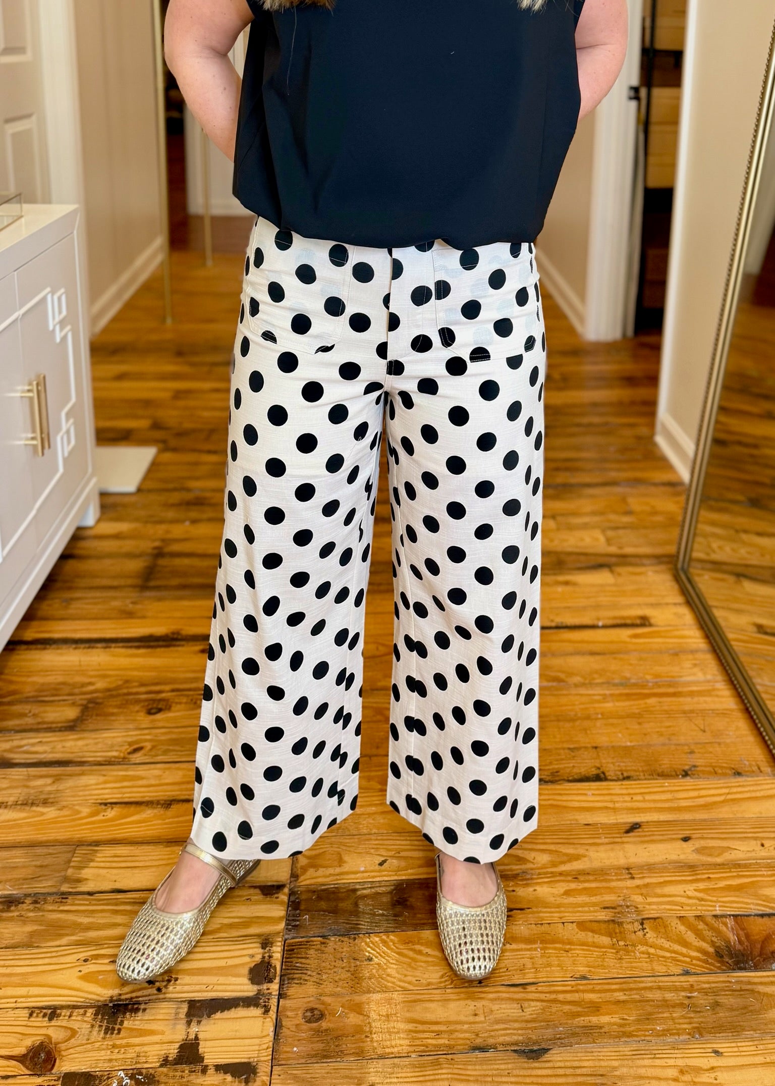 Make a bold statement with these Polka Dot Print Wide Pants. The playful polka dot pattern brings vintage-inspired charm with a modern edge, while the relaxed wide-leg silhouette offers effortless comfort and movement. Perfect for those ready to embrace retro flair without apology, these pants transition seamlessly from casual outings to confident night-out looks. Pair with fitted tops to balance the voluminous cut, or go all-in with equally daring pieces for maximum impact.