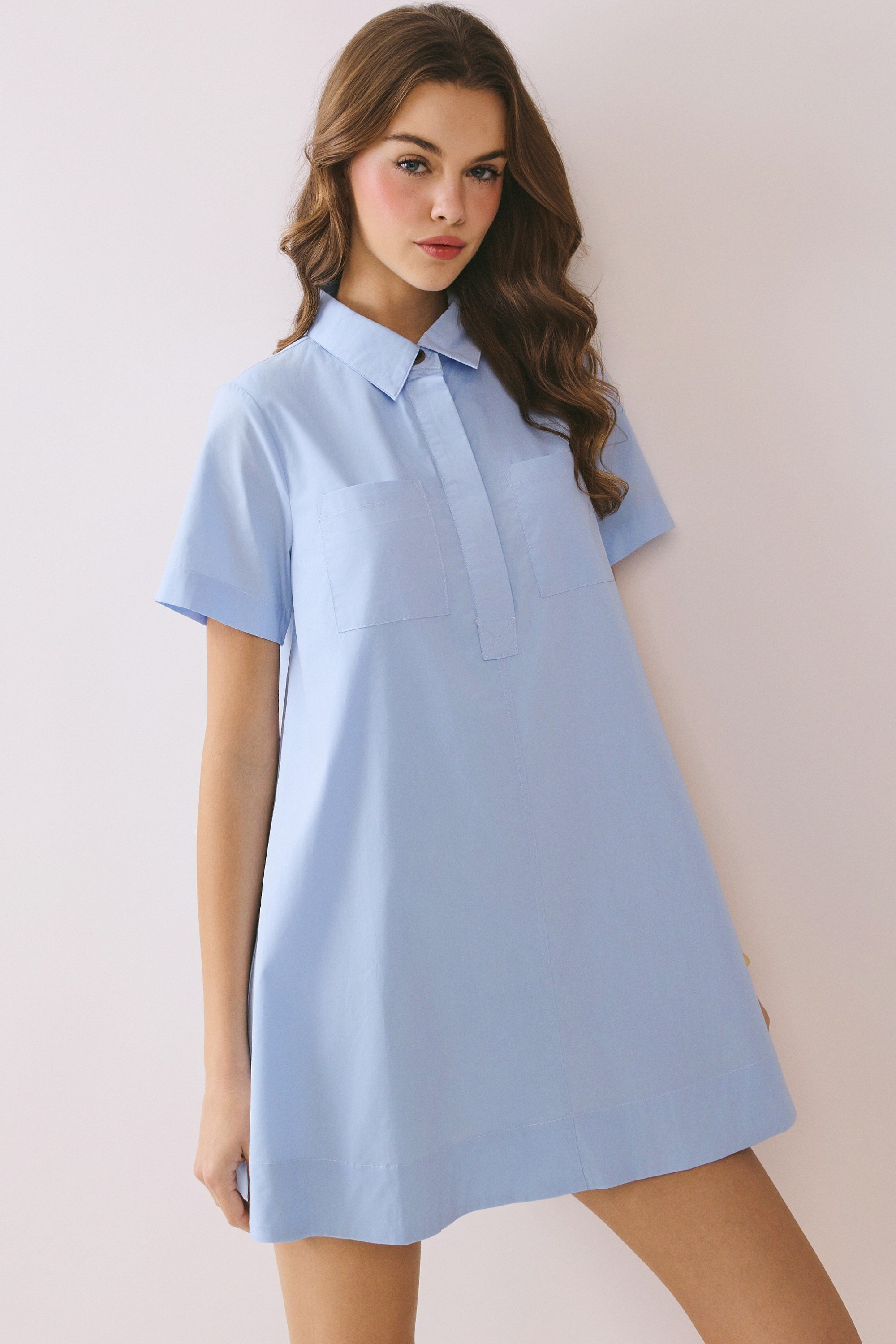Make a statement in this baby blue shirt dress that refuses to play it safe. Bold contrast stitching runs throughout, creating sharp geometric lines that catch the eye and demand attention. The classic button-down silhouette gets an edge with those striking seams—structured enough for confidence, comfortable enough for all-day wear. Whether you're layering it or wearing it solo, this piece transforms the everyday into something unforgettable. Daring style meets wearable sophistication.