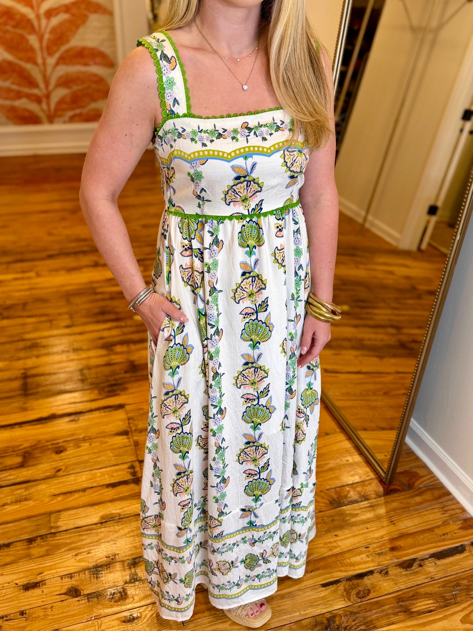 Cream and Green Floral Maxi Dress