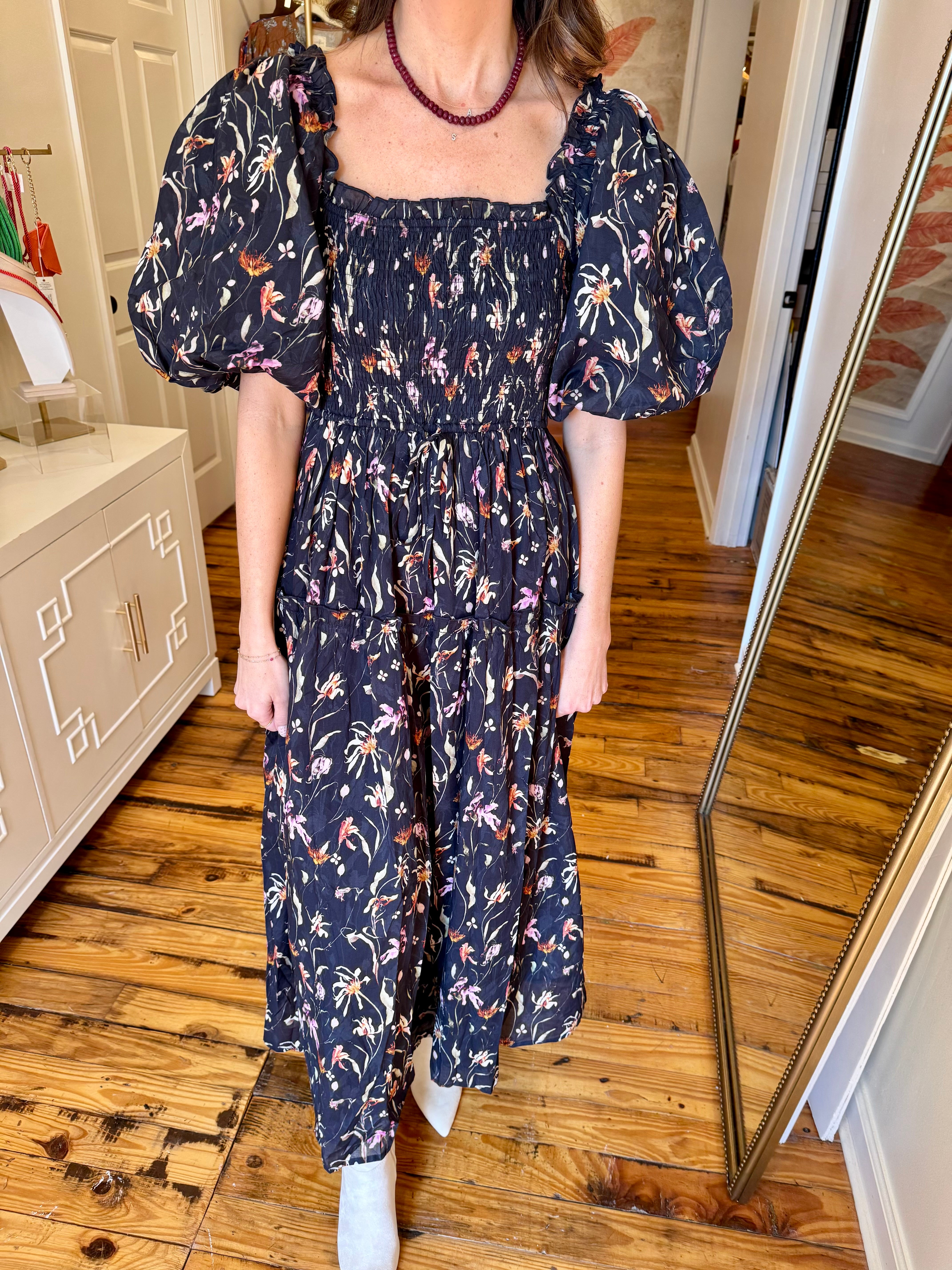 Navy Floral Smocked Maxi Dress