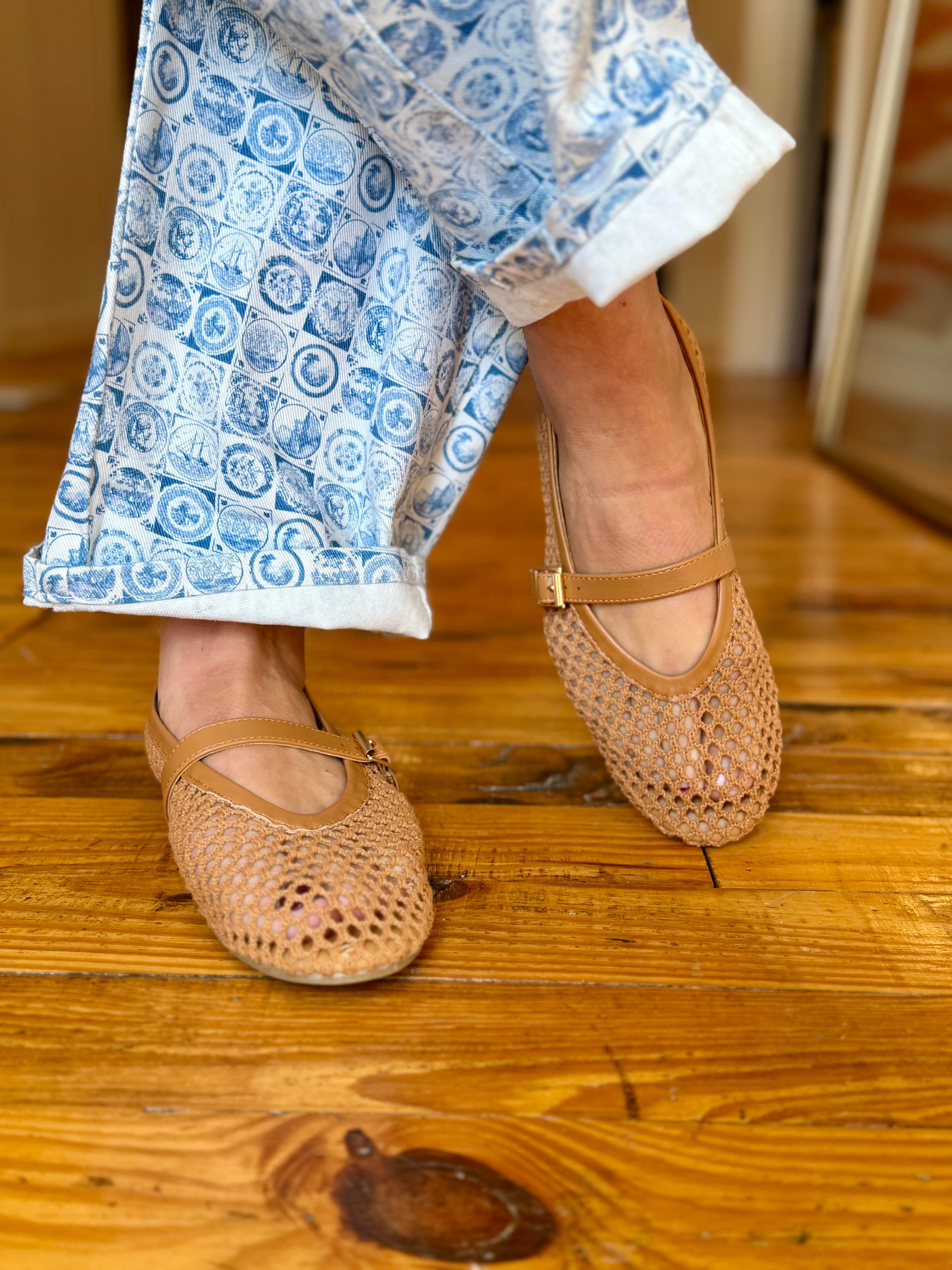 Vegan, fishnet Mary Jane ballet flat.