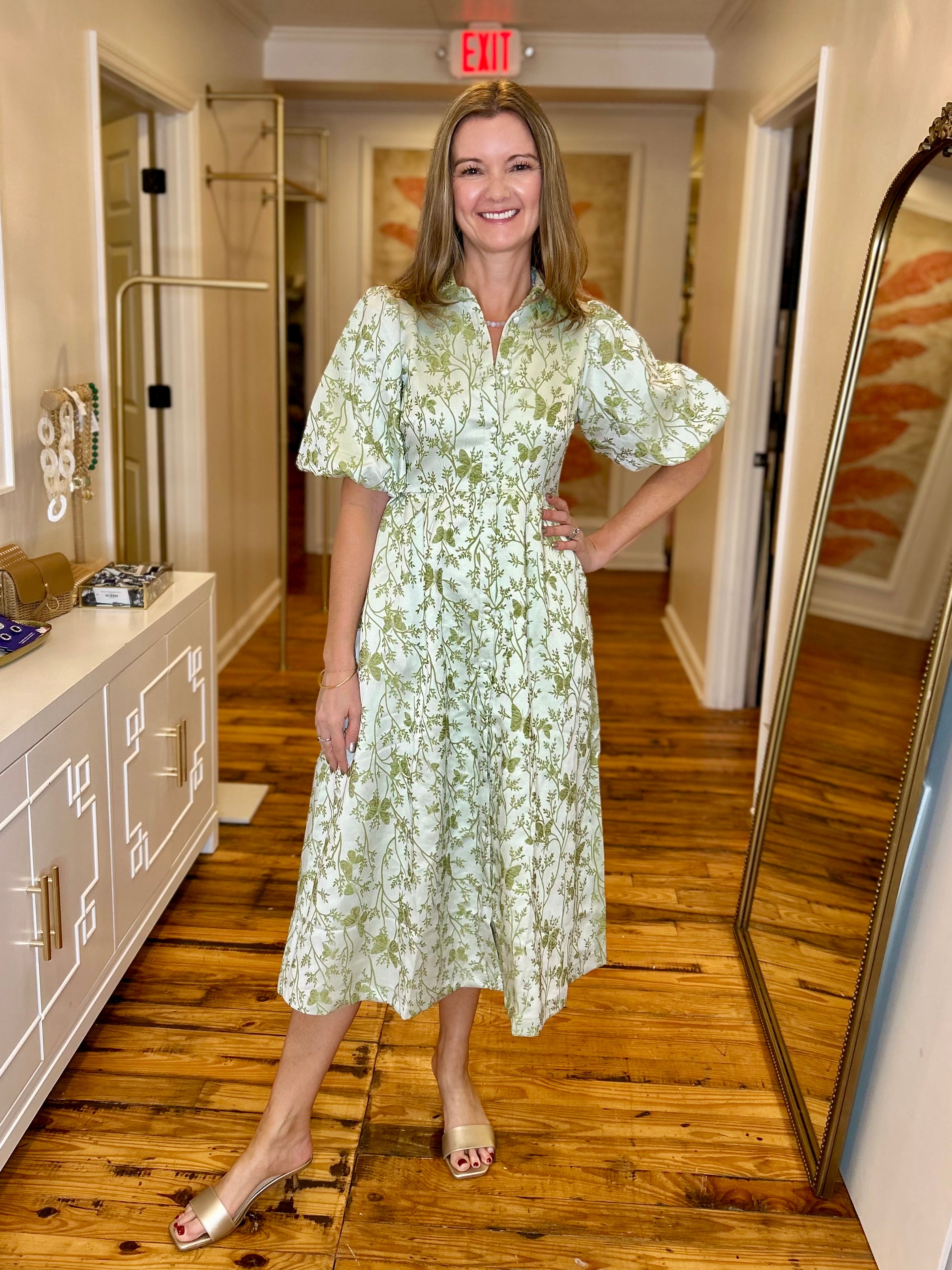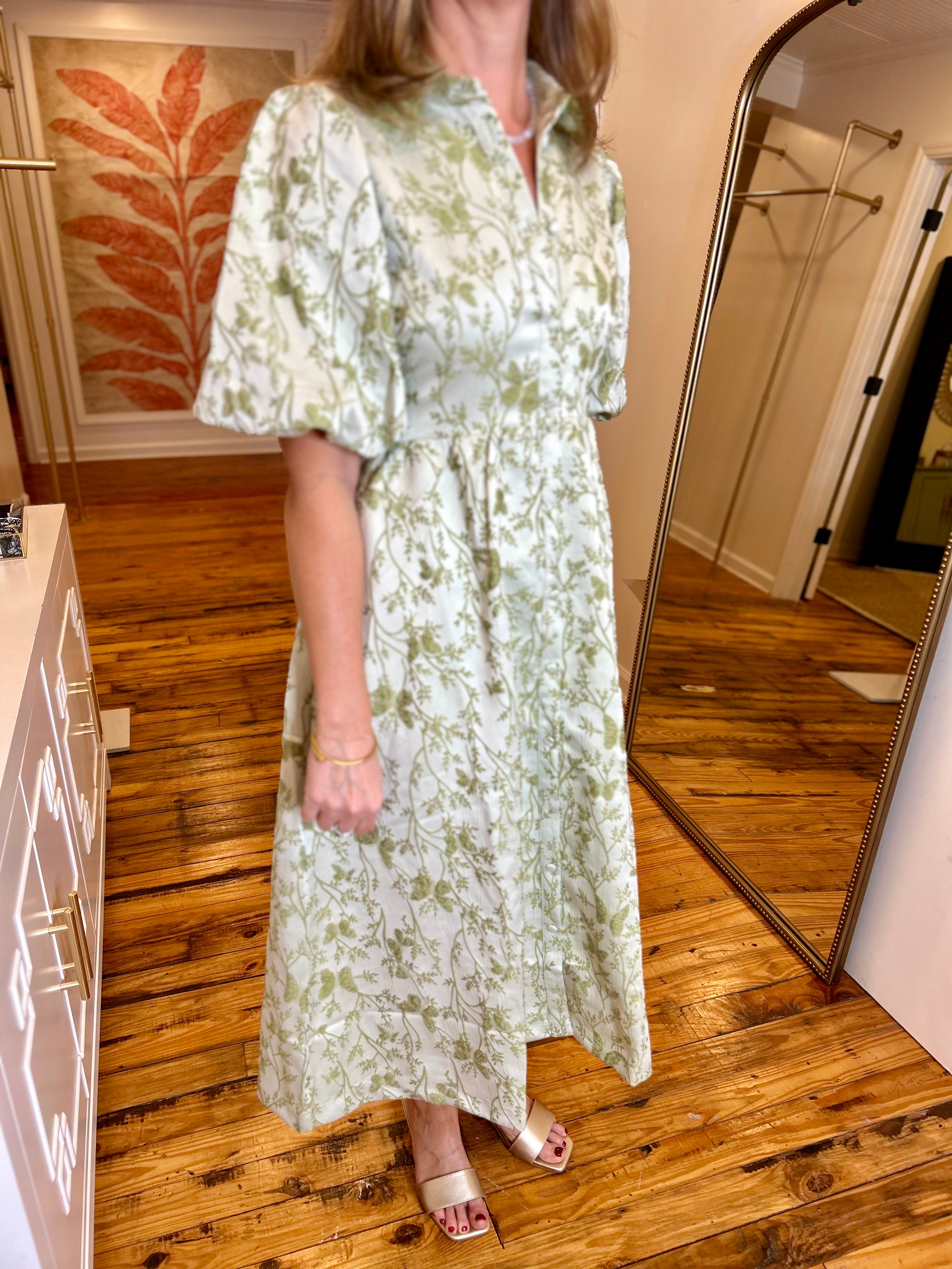 Green Jacquard Bubble Sleeve Button Down Midi Dress