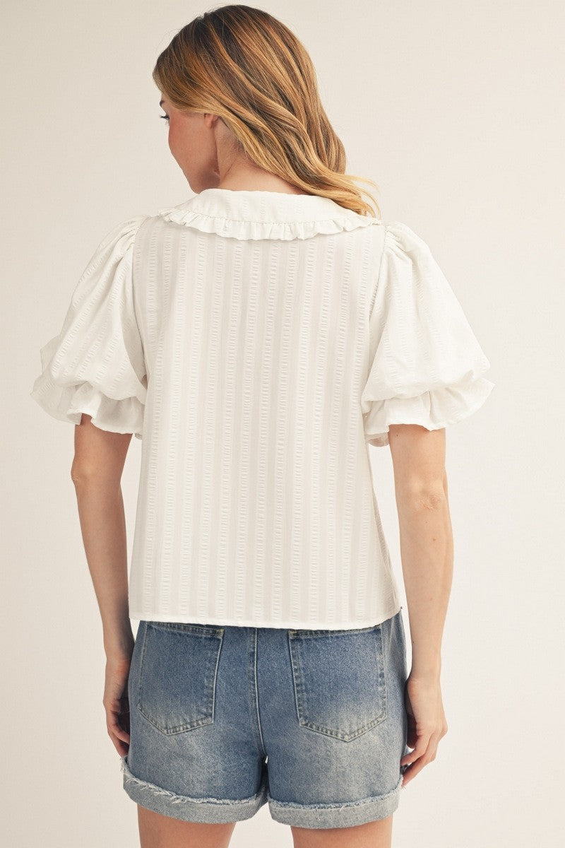 Short puff sleeves button down stripe top with ruffled Peter Pan collar, stripe print textured fabric.