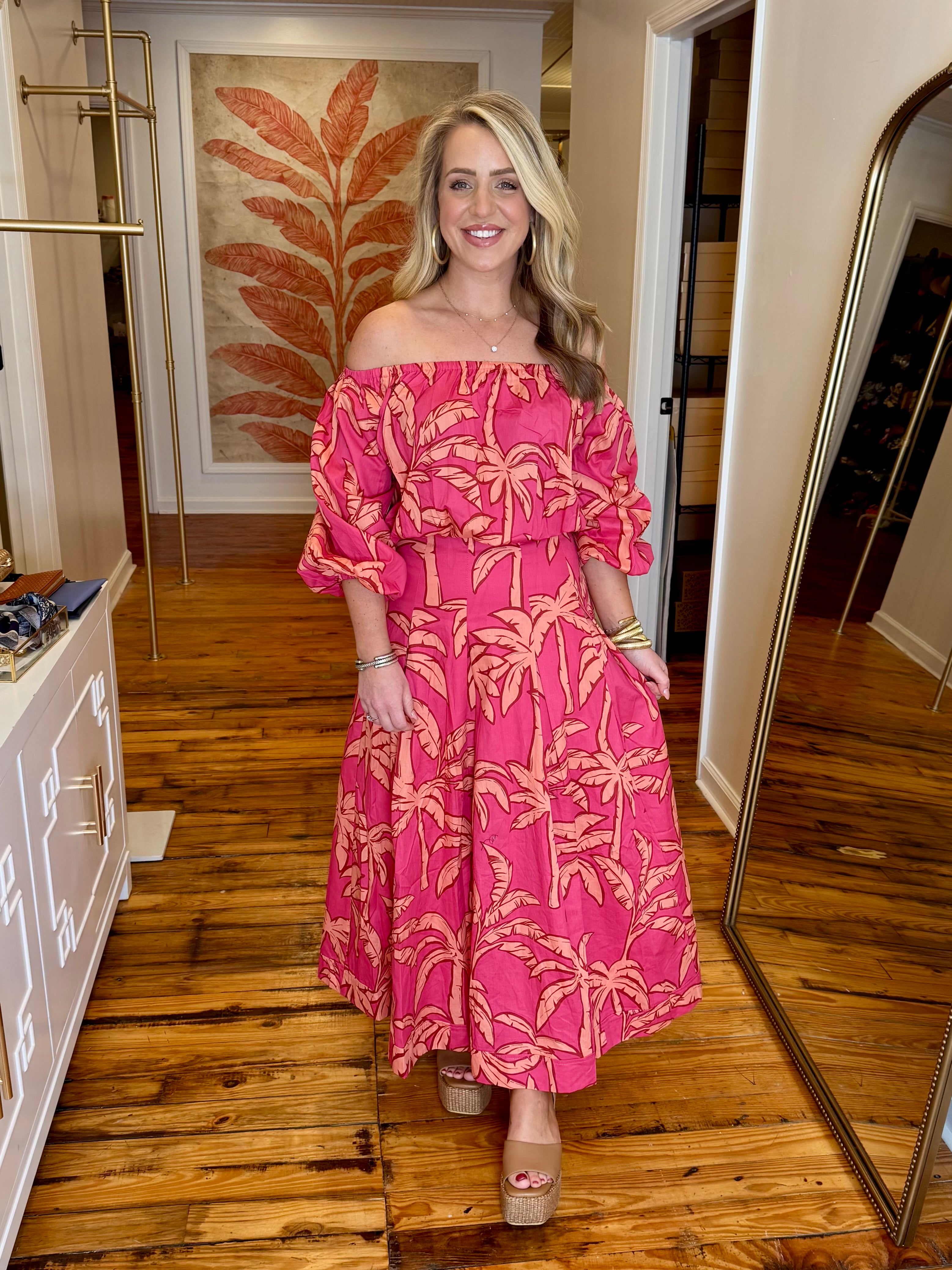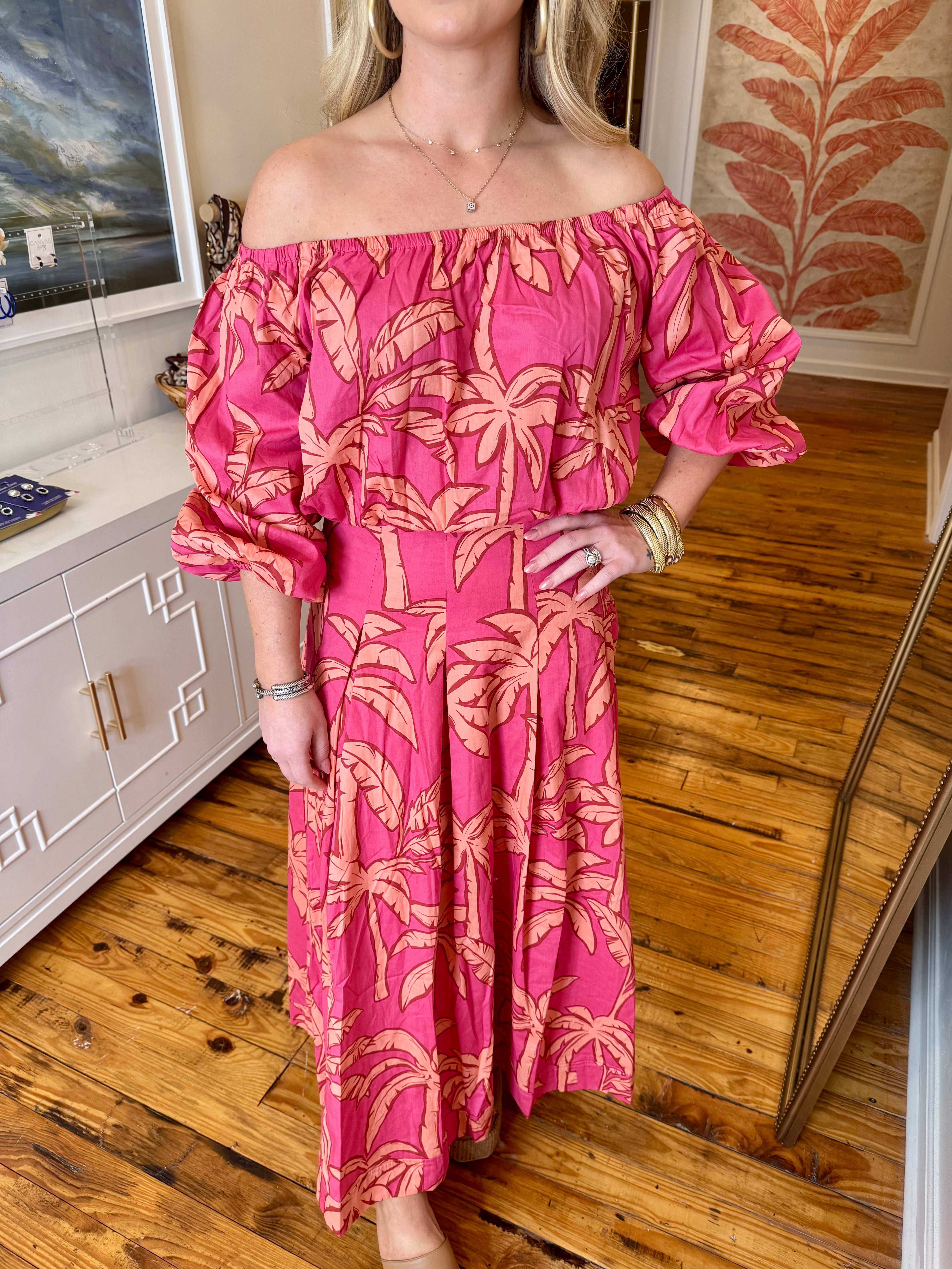 Escape to paradise with this breezy two-piece set featuring a charming pink palm print. The off-shoulder top flaunts a flirty neckline, while the flowing maxi skirt skims gracefully to the ground. Mix tropical vibes with effortless elegance—ideal for beach getaways, resort wear, or turning heads at your next summer soirée. Slip into something that feels like a vacation in fabric form!