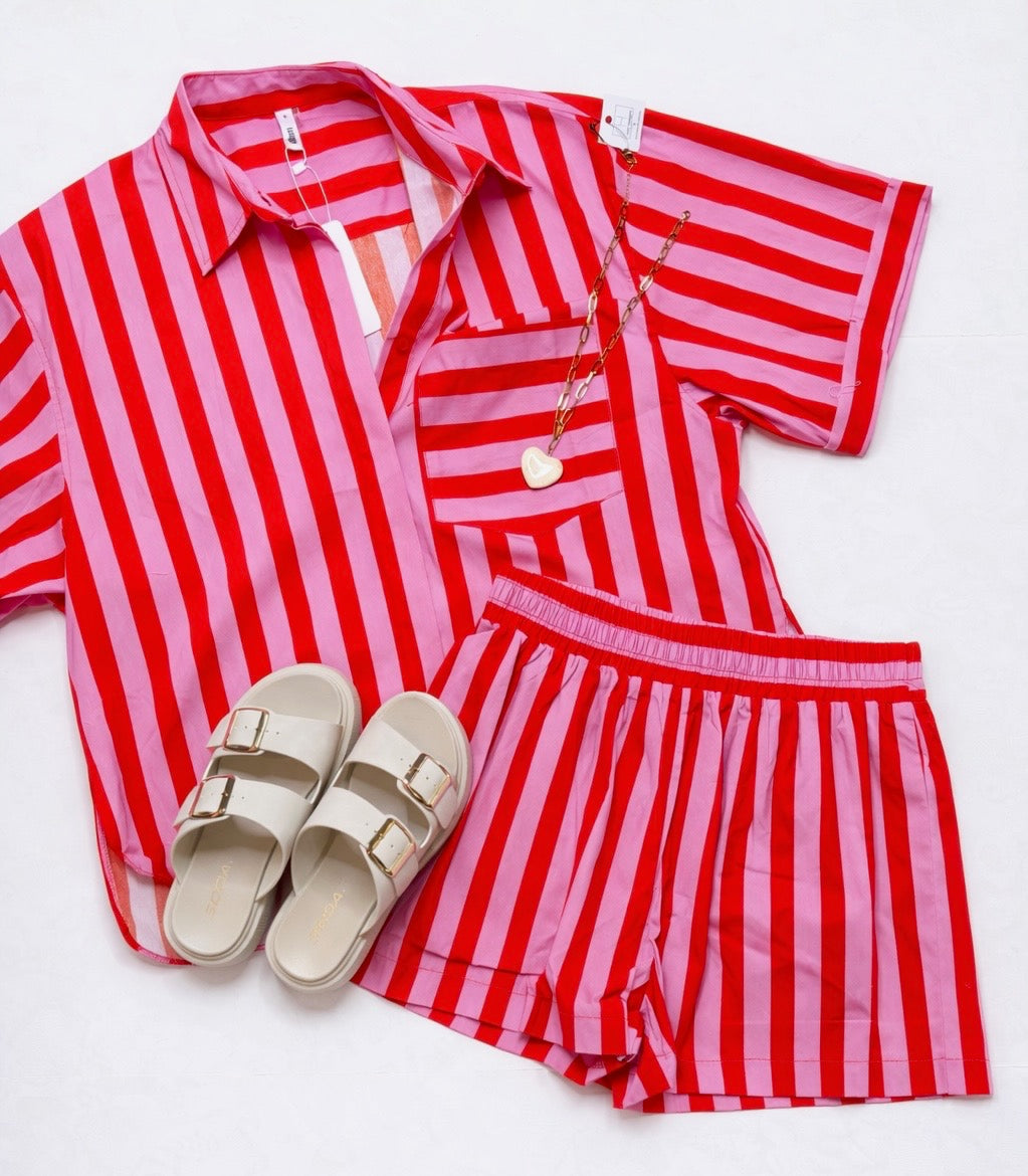 Red & Pink Striped Button Up Top