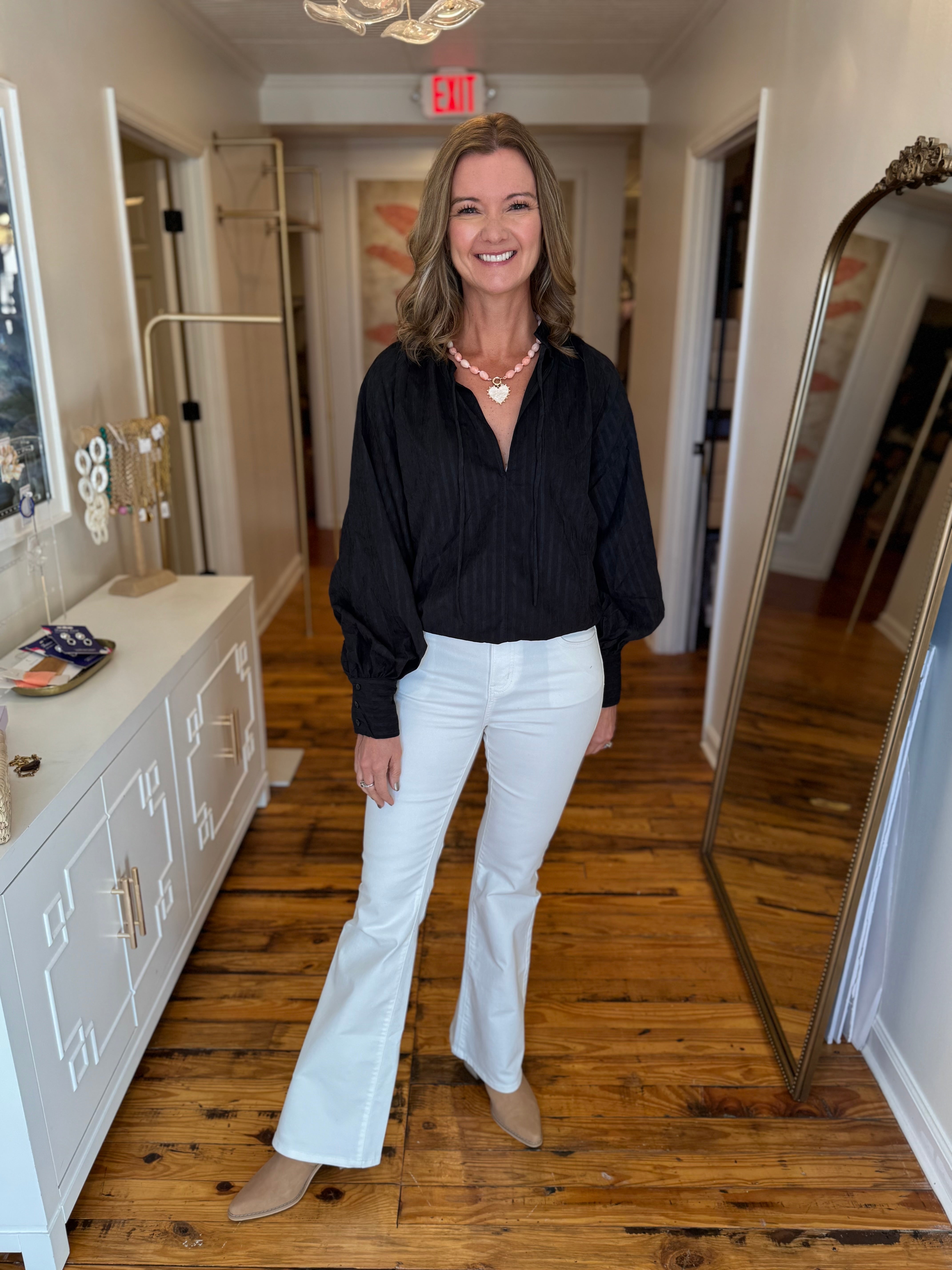 Elevate your wardrobe with this striking Black Piping Detail Blouse—a bold statement piece that commands attention. Sharp contrast piping traces the silhouette, creating sharp lines that flatter and define. Perfect for those who refuse to blend in, this blouse pairs effortlessly with tailored trousers or edgy denim for an undeniably confident look. Whether you're making power moves at the office or turning heads at night, this is the piece that says you're fearless.