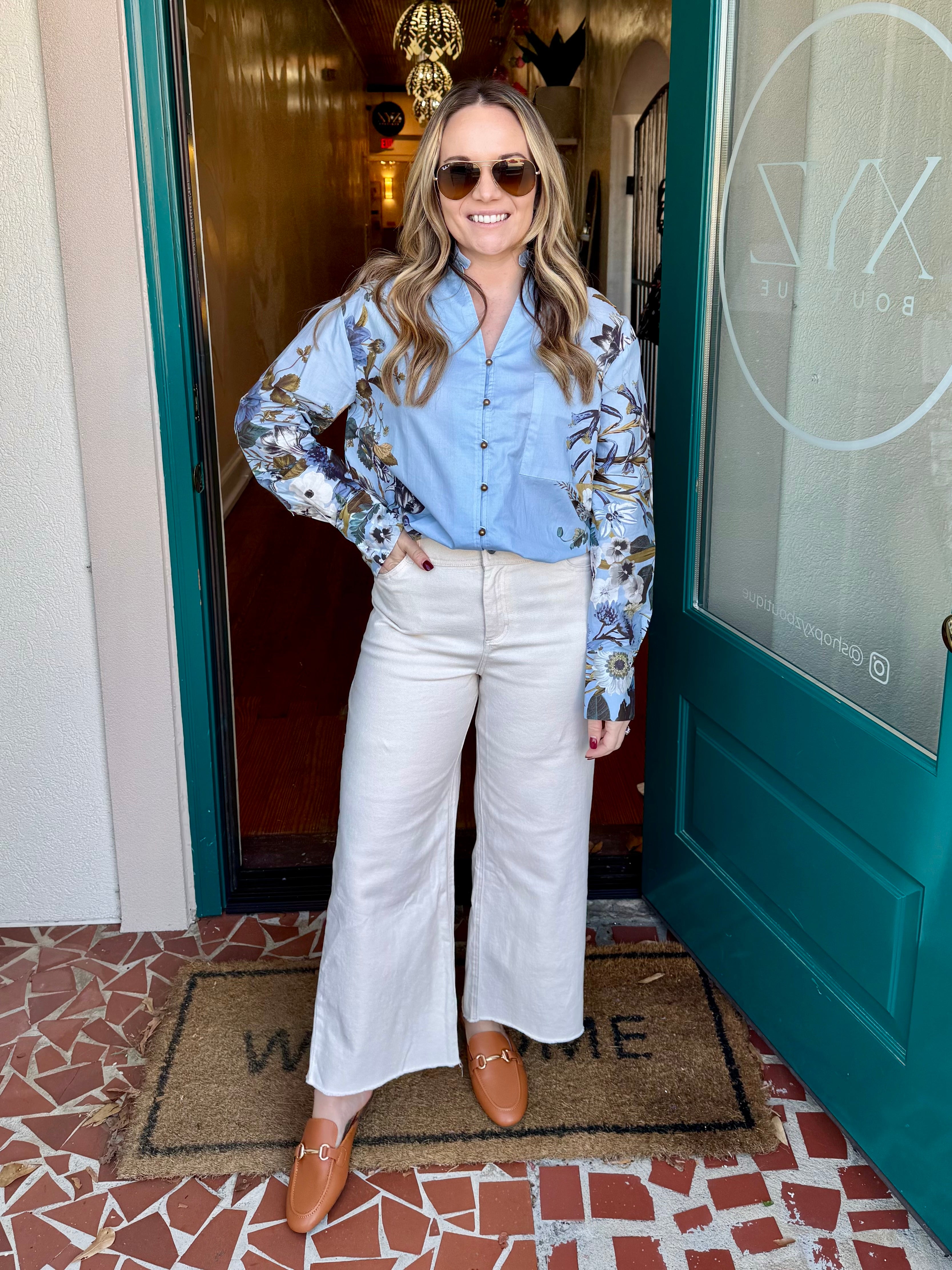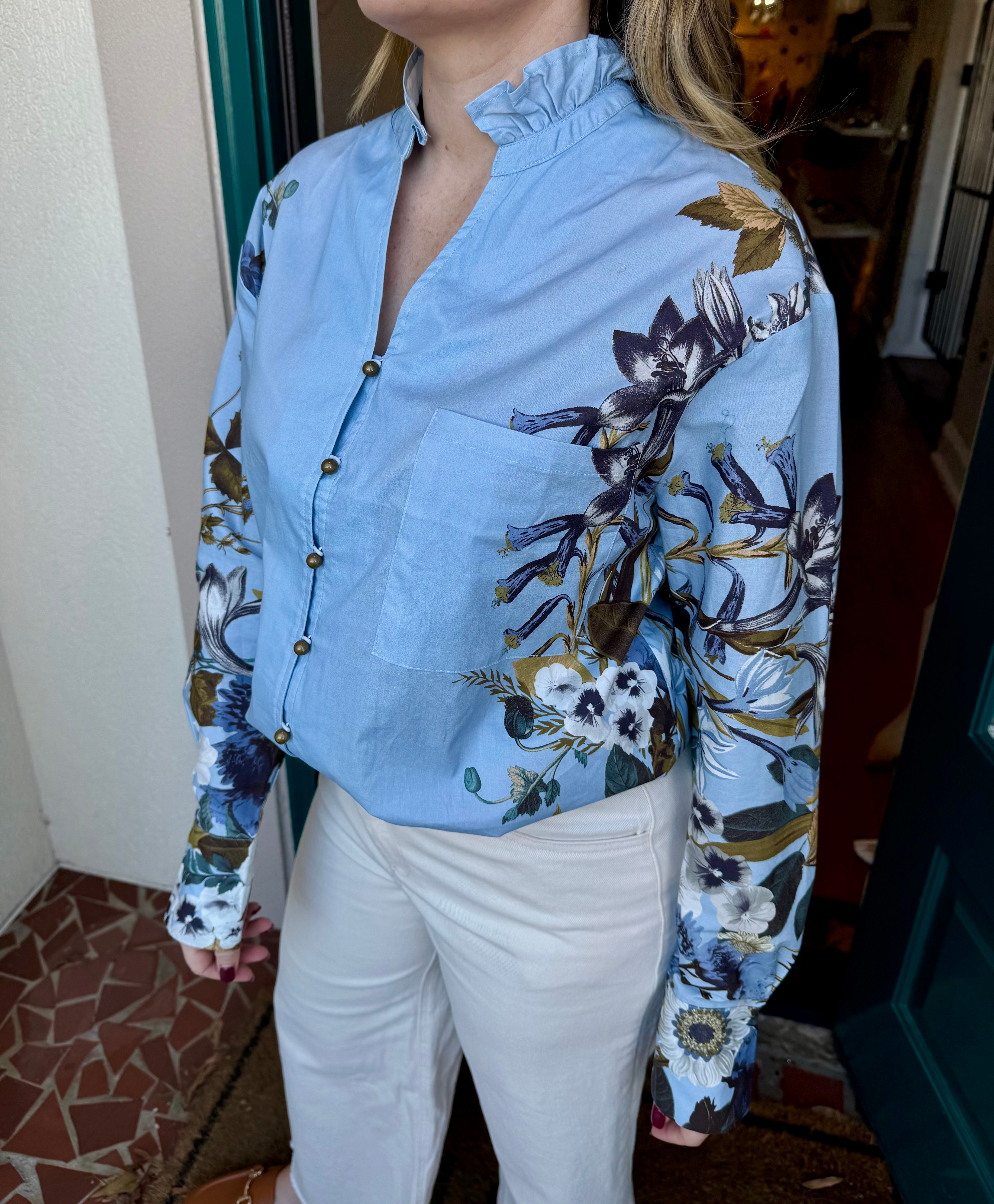 Blue Floral Accent Sleeves Top