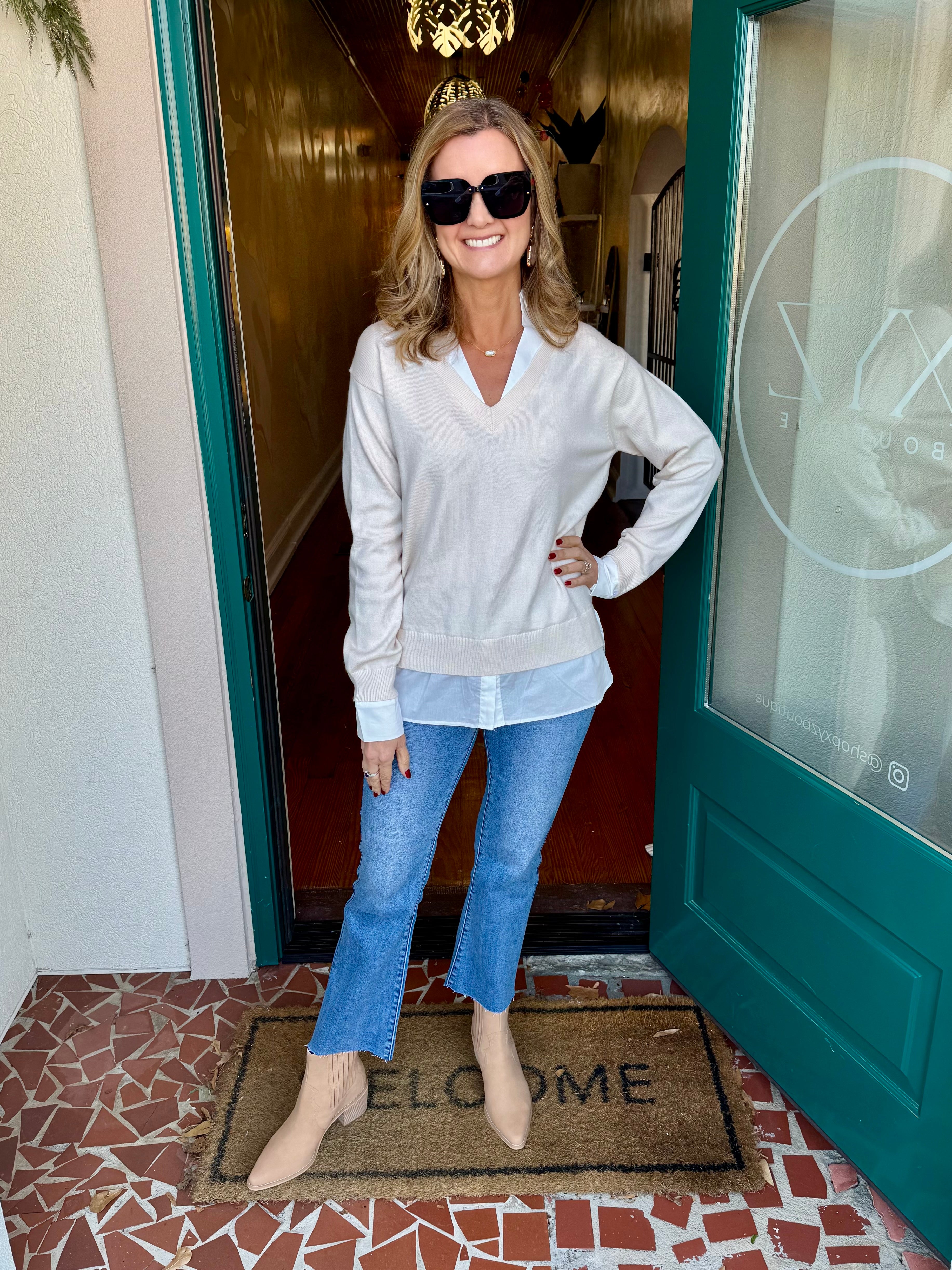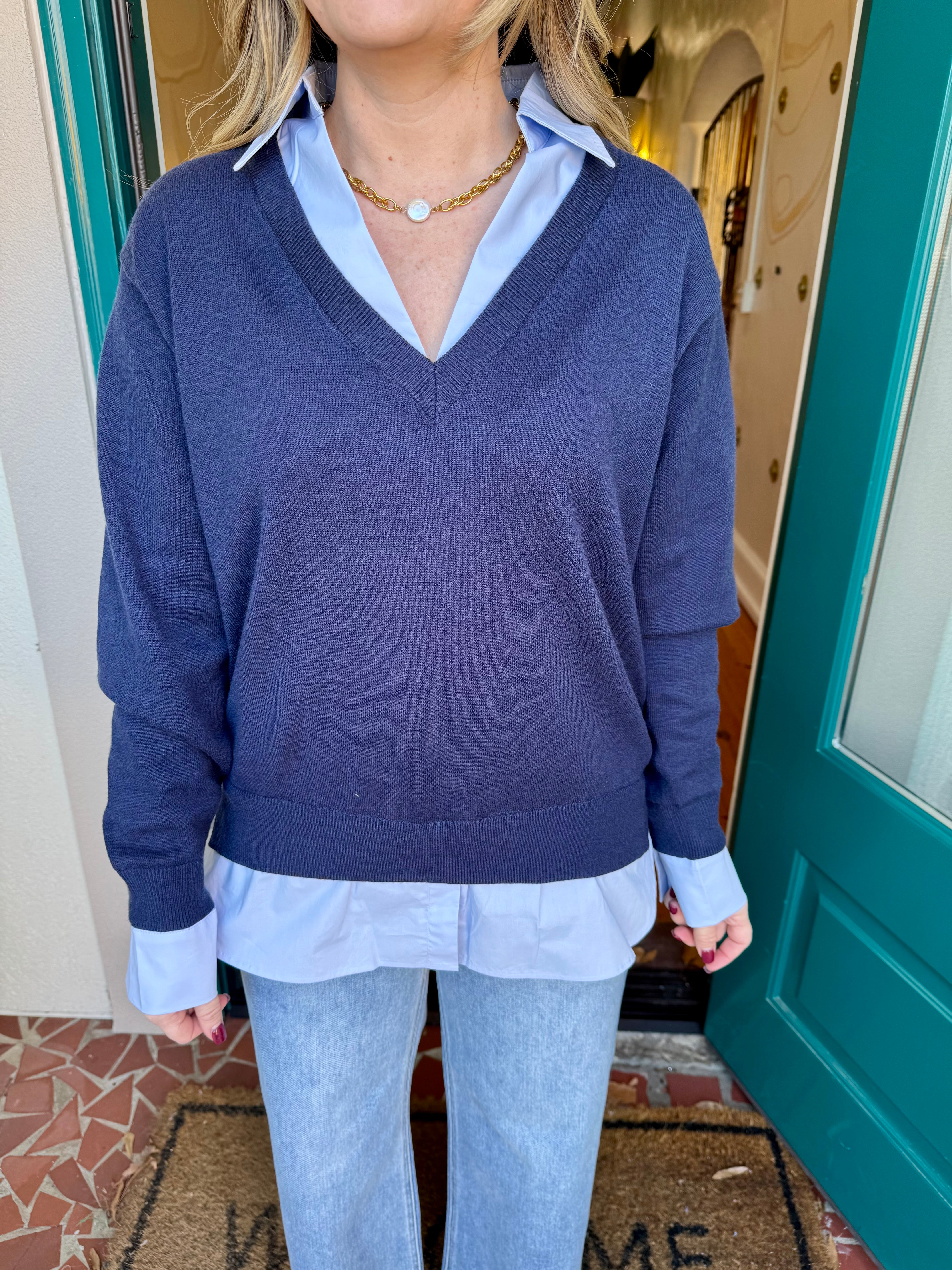 Layered Look V-neck Mixed Media Sweater