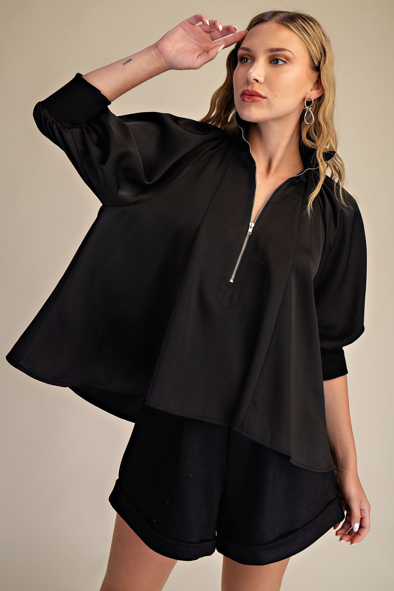 Mock Neck Band Puff Sleeve Blouse