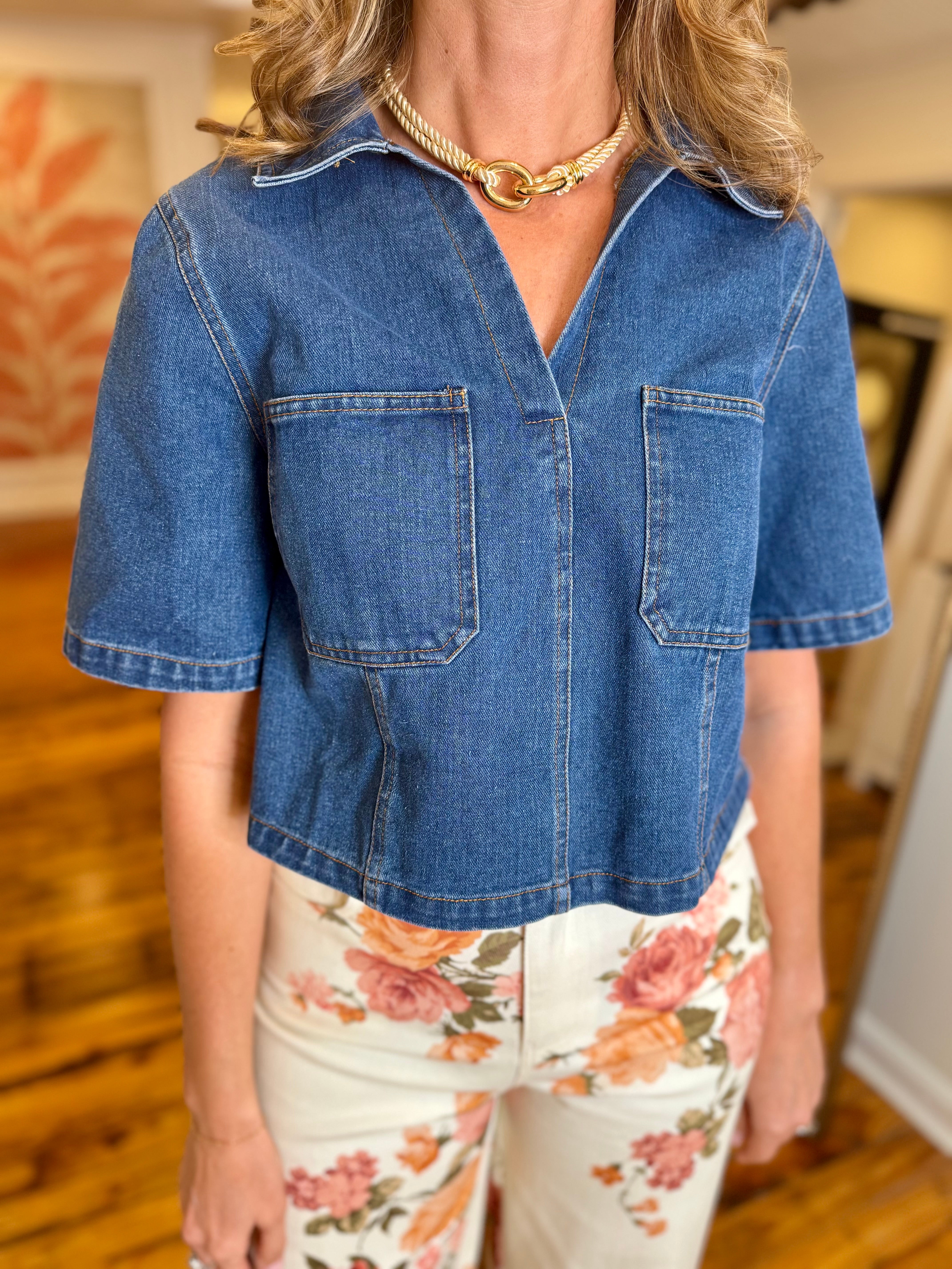 Solid short sleeve denim woven top featuring spread collar V-neck. Patch pockets at front. Back yoke with center pleat detail. Unlined. Woven. Non-sheer. Lightweight.