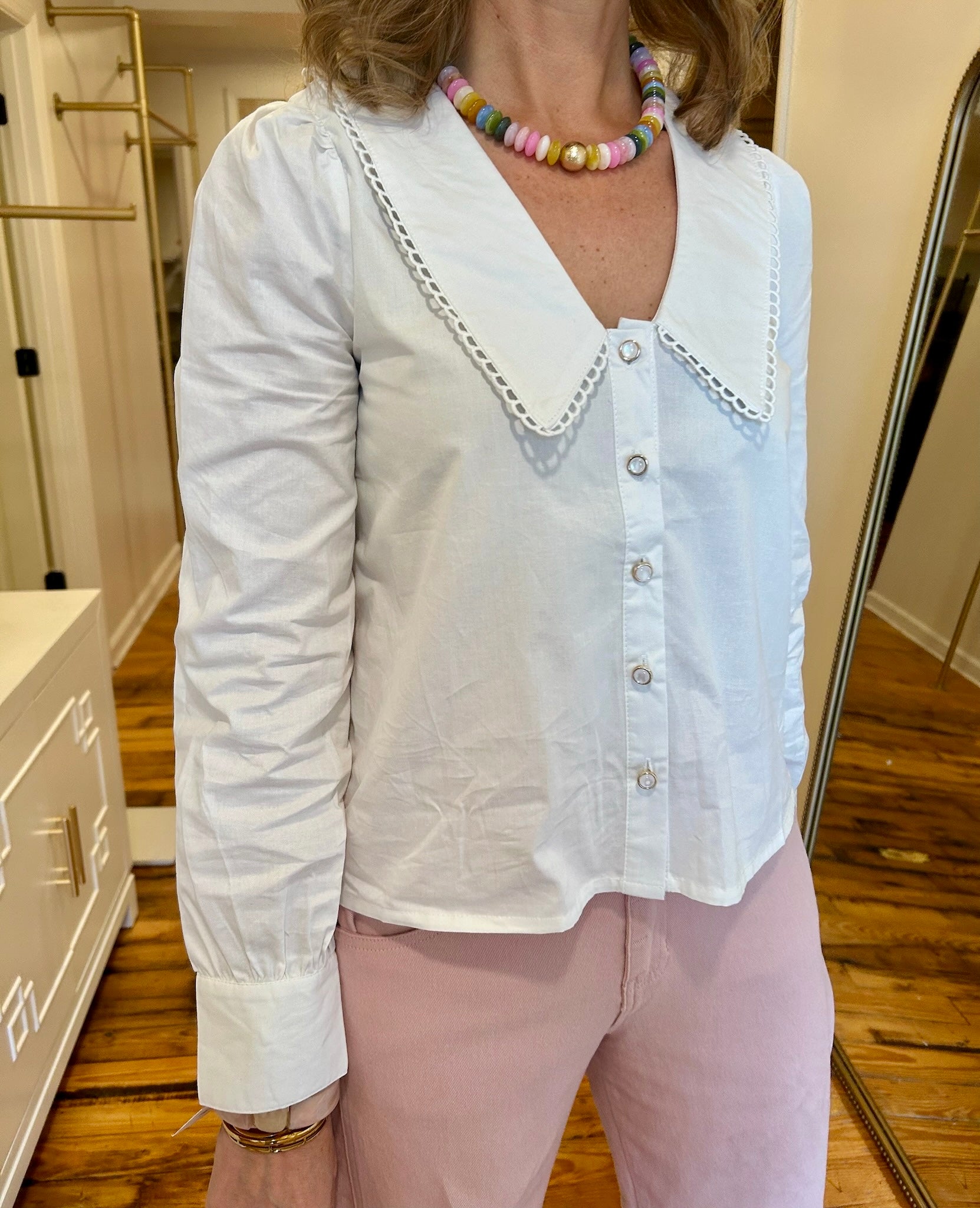 Elevate your everyday style with this striking white collared long sleeve blouse—a fearless wardrobe essential that commands attention. The crisp, clean lines of the collar frame your face while the structured long sleeves deliver polished sophistication. Perfect for those ready to make bold moves, whether you're dominating the boardroom or turning heads at dinner. Layer it, tuck it, or wear it solo—this versatile piece bends to your confidence. Timeless elegance meets modern edge in a blouse that refuses to play it safe.