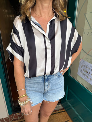 Black Striped Oversized Hidden Placket Button Down Hem Top
