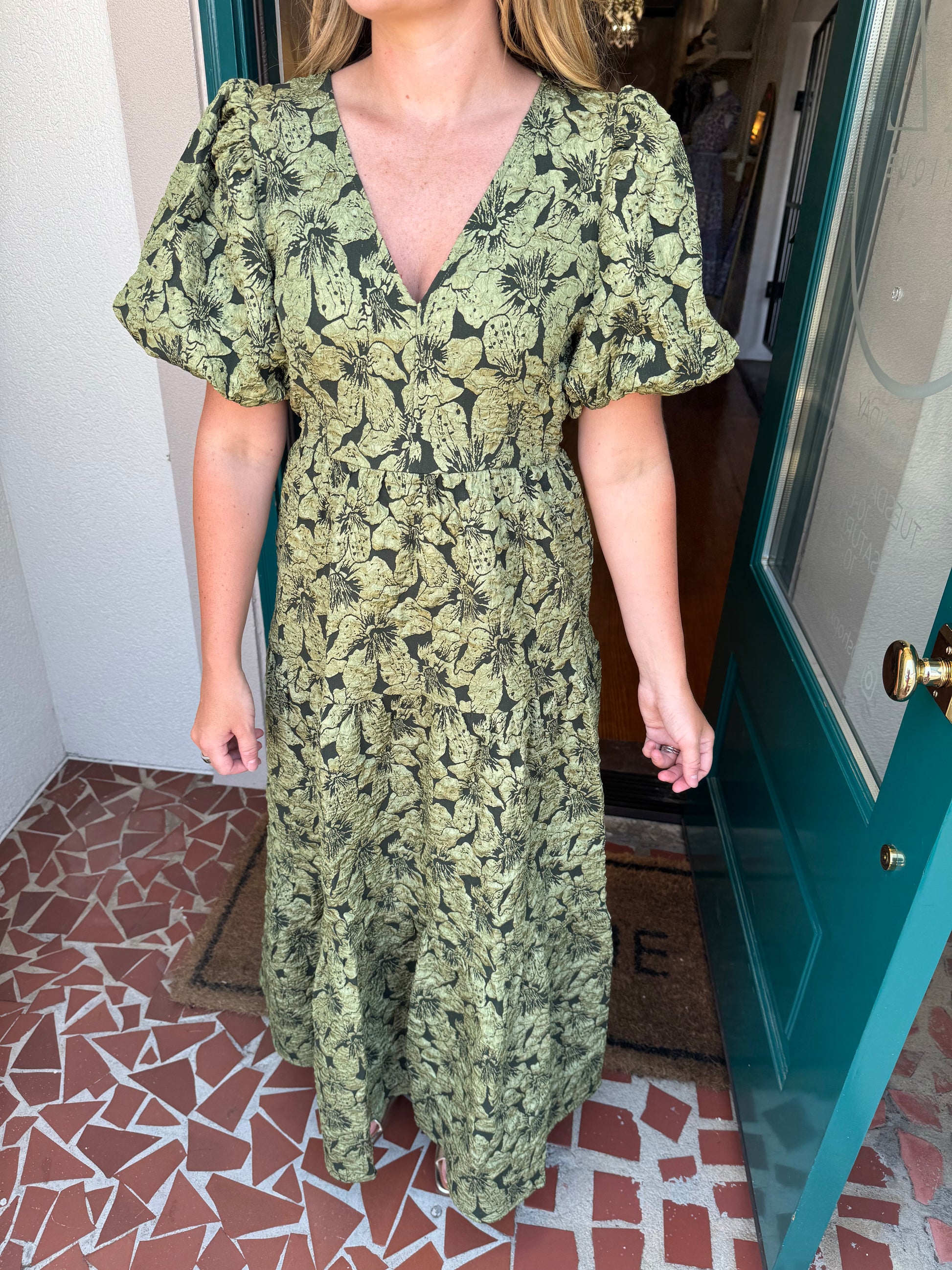 Beautiful days deserve beautiful style like the Arielle Luna Poplin Floral Maxi Dress! Made from a lightweight fabric, it features a shallow v neckline with floral details all down. The puff balloon sleeves and open back sit on the tiered bottom skirt. Pair the look with white or nude mules and you're good to go. - Puff sleeves - V-neckline - Open back!
