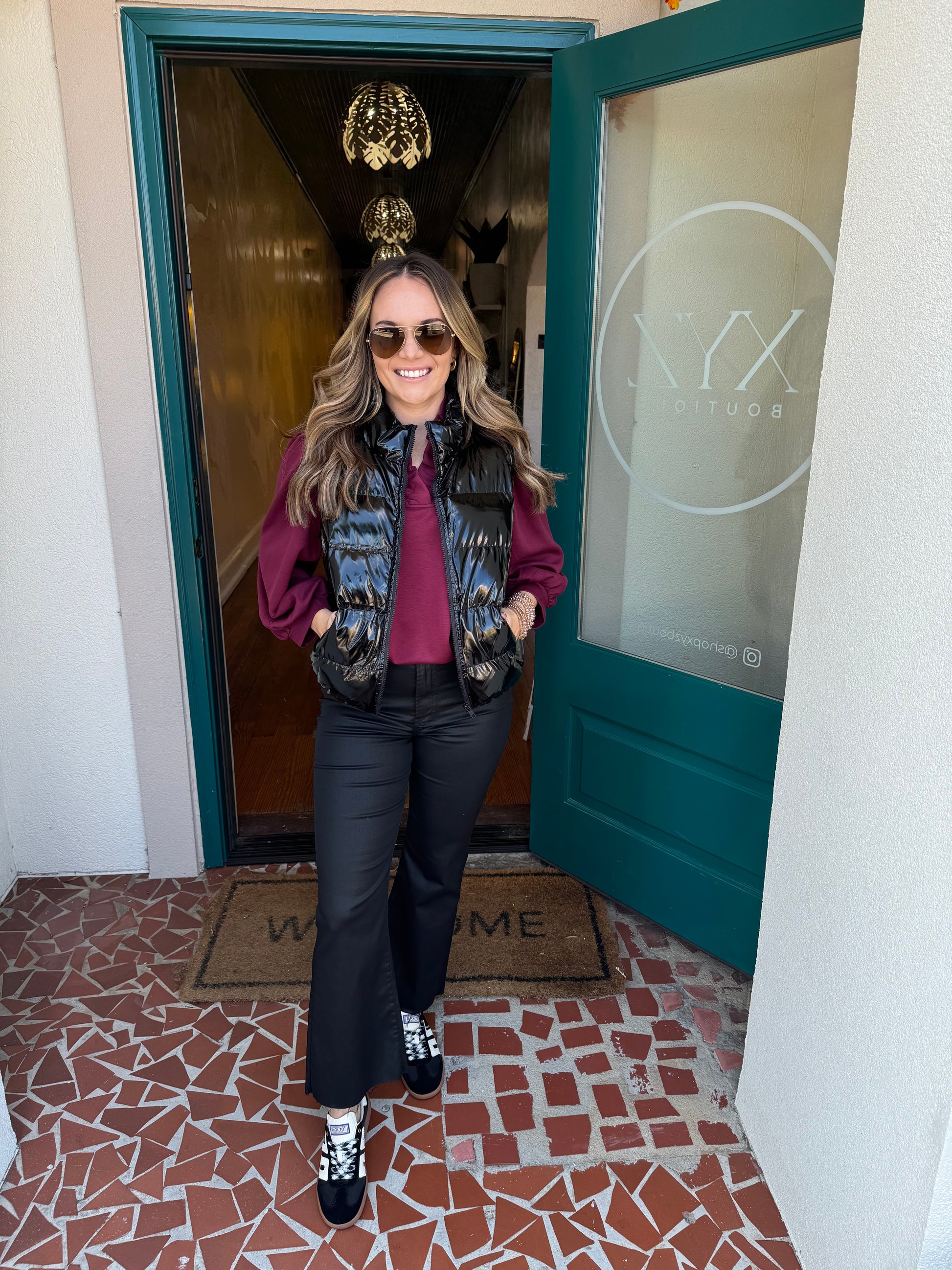 Burgundy Luxeknit Ruffle Neck Blouse with Puff Sleeves