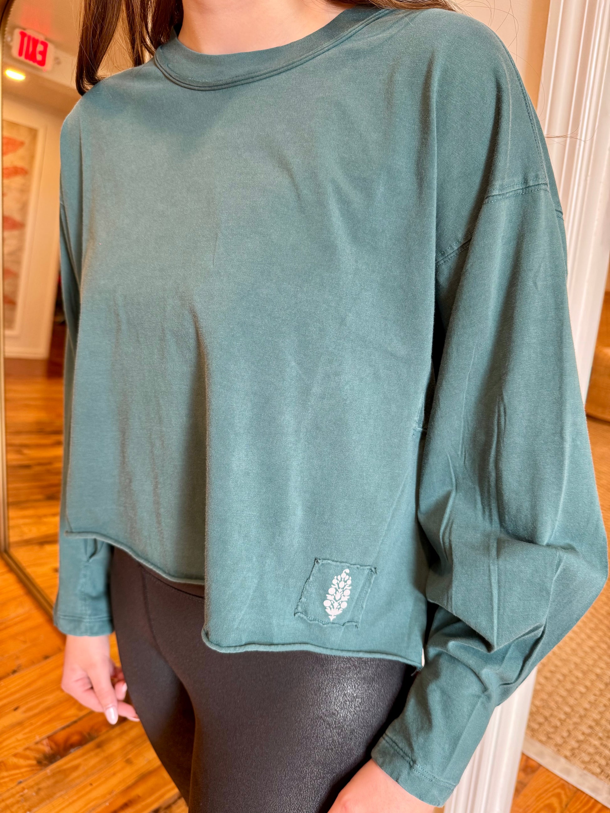 Warm up or cool down in this essential long-sleeve, featured in a boxy silhouette and slightly cropped fit with a classic crew neckline and raw-edge trim.