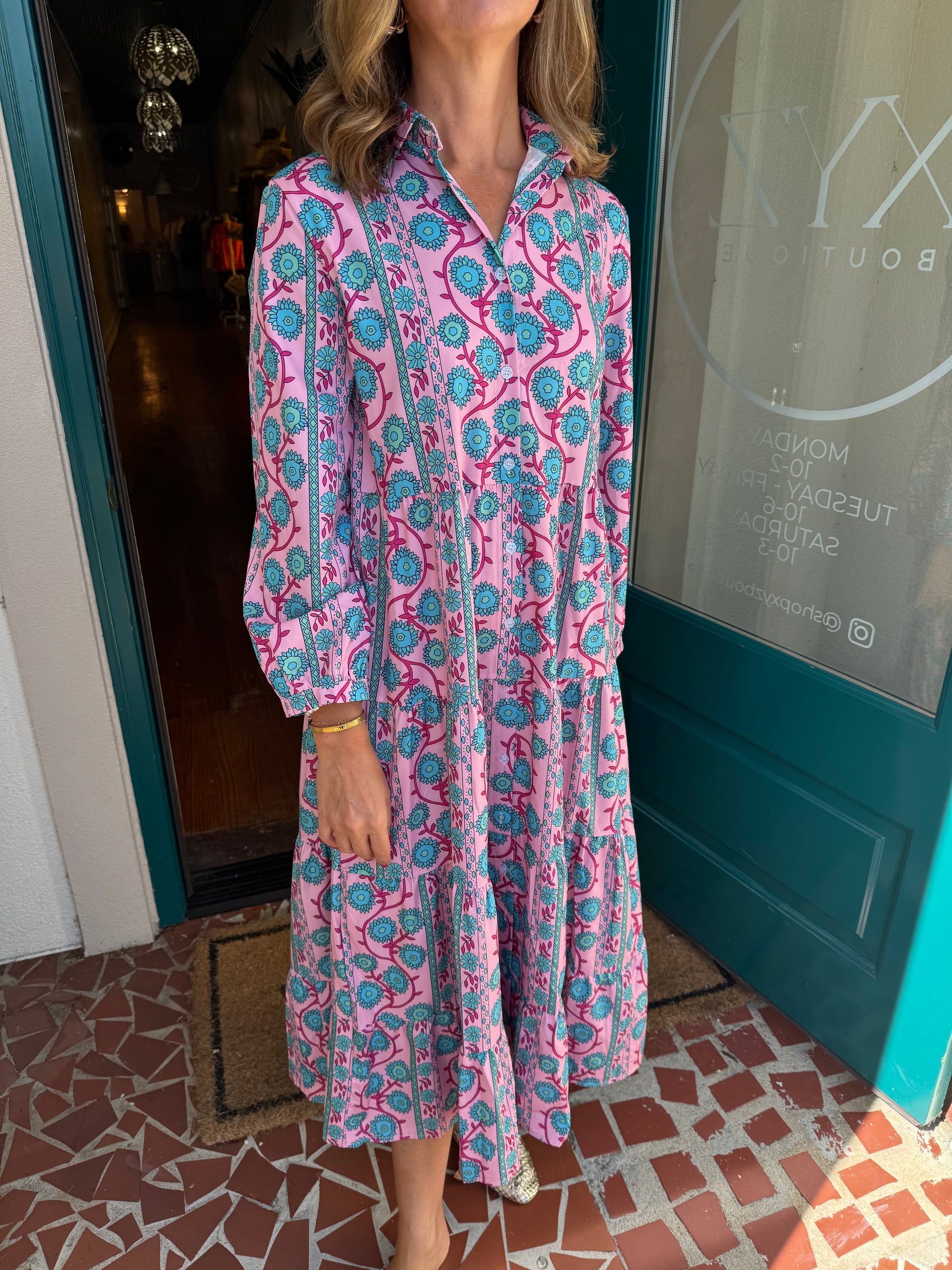 Pink Floral Print Long Sleeve Button Down Ruffle Dress