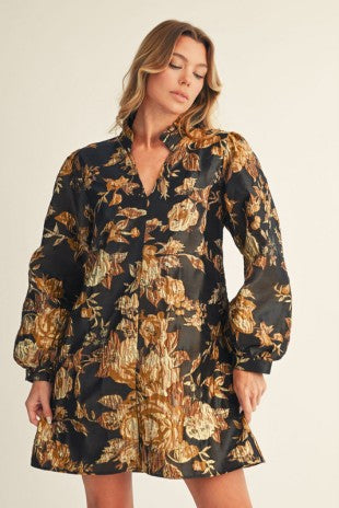 Ruffled Neck Floral Jacquard Dress