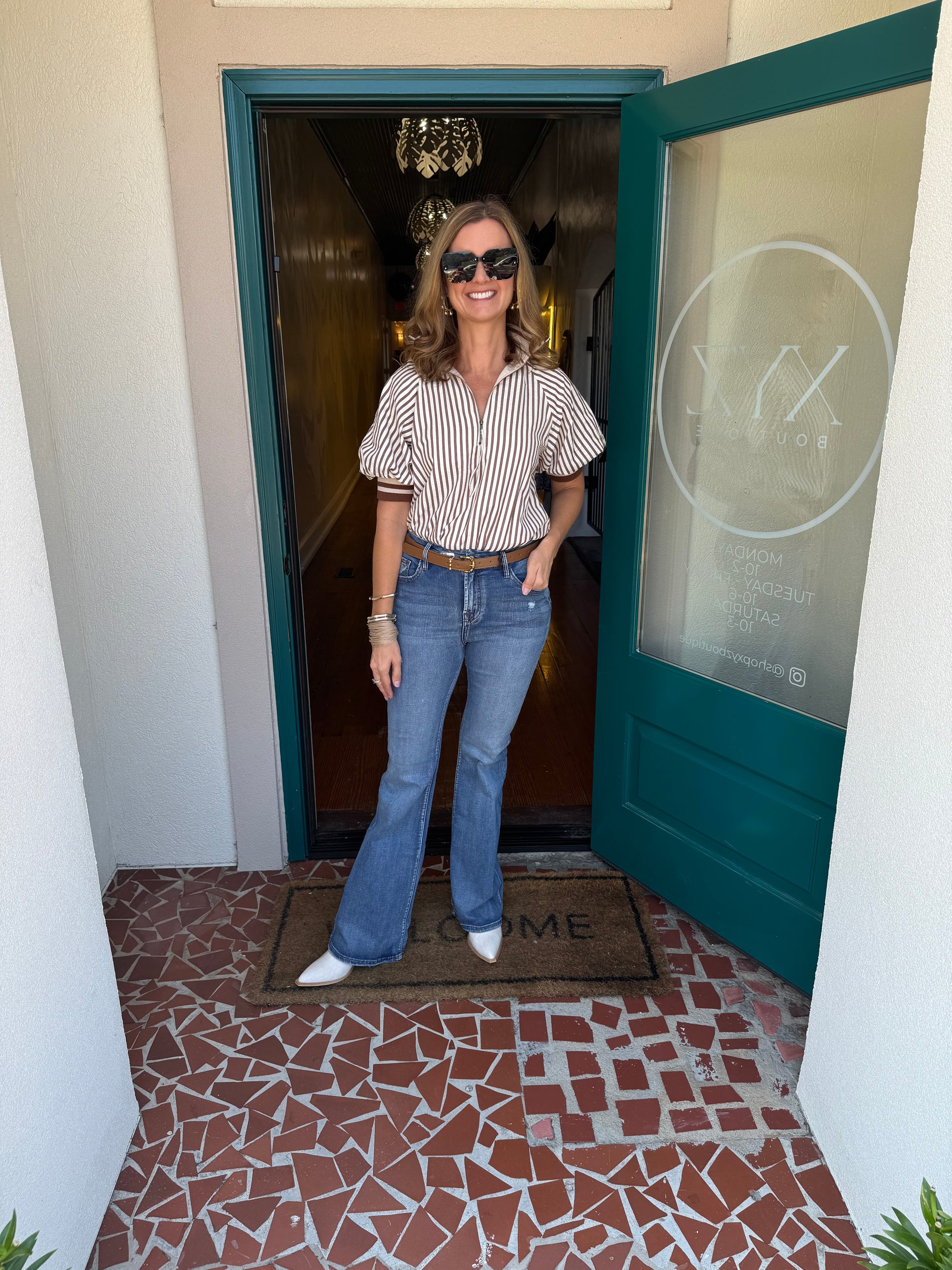 Stripe pattern half-zip closure short puff sleeve top featuring multicolor accent band. Unlined. Woven. Non-sheer. Lightweight.