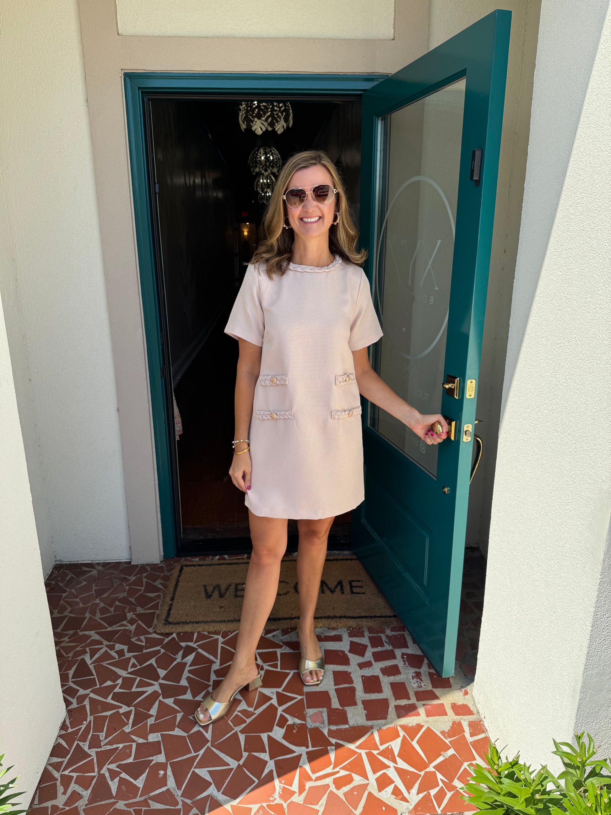 Tweed round neck short sleeve mini dress featuring braid detail at neckline and front. Faux pocket and button detail at front. Zipper closure at back. Lined. Woven. Non-sheer. Lightweight.